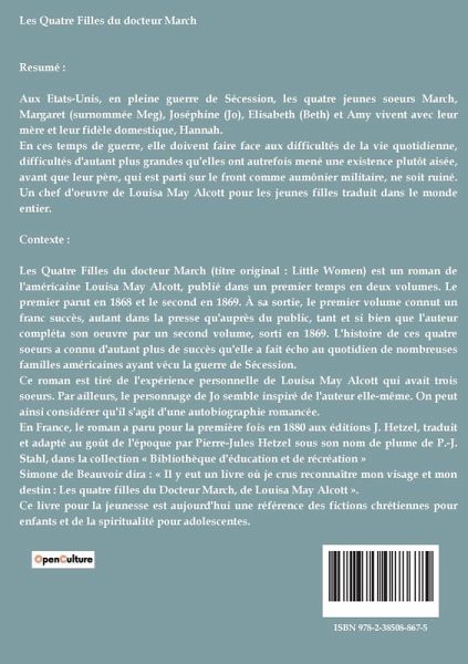 Les Quatre Filles du docteur March Resumé : Aux Etats-Unis, en pleine guerre de Sécession, les quatre jeunes soeurs March, Margaret (surnommée Meg), Joséphine (Jo), Elisabeth (Beth) et Amy vivent avec leur mère et leur fidèle domestique, Hannah. En ces temps de guerre, elle doivent faire face aux difficultés de la vie quotidienne, difficultés d'autant plus grandes qu'elles ont autrefois mené une existence plutôt aisée, avant que leur père, qui est parti sur le front comme aumônier militaire, ne soit ruiné. Un chef d'oeuvre de Louisa May Alcott pour les jeunes filles traduit dans le monde entier. Contexte : Les Quatre Filles du docteur March (titre original : Little Women) est un roman de l'américaine Louisa May Alcott, publié dans un premier temps en deux volumes. Le premier parut en 1868 et le second en 1869. À sa sortie, le premier volume connut un franc succès, autant dans la presse qu'auprès du public, tant et si bien que l'auteur compléta son oeuvre par un second volume, sorti en 1869. L'histoire de ces quatre soeurs a connu d'autant plus de succès qu'elle a fait écho au quotidien de nombreuses familles américaines ayant vécu la guerre de Sécession. Ce roman est tiré de l'expérience personnelle de Louisa May Alcott qui avait trois soeurs. Par ailleurs, le personnage de Jo semble inspiré de l'auteur elle-même. On peut ainsi considérer qu'il s'agit d'une autobiographie romancée. En France, le roman a paru pour la première fois en 1880 aux éditions J. Hetzel, traduit et adapté au goût de l'époque par Pierre-Jules Hetzel sous son nom de plume de P.-J. Stahl, dans la collection « Bibliothèque d'éducation et de récréation » Simone de Beauvoir dira : « Il y eut un livre où je crus reconnaître mon visage et mon destin : Les quatre filles du Docteur March, de Louisa May Alcott ». Ce livre pour la jeunesse est aujourd'hui une référence des fictions chrétiennes pour enfants et de la spiritualité pour adolescentes.