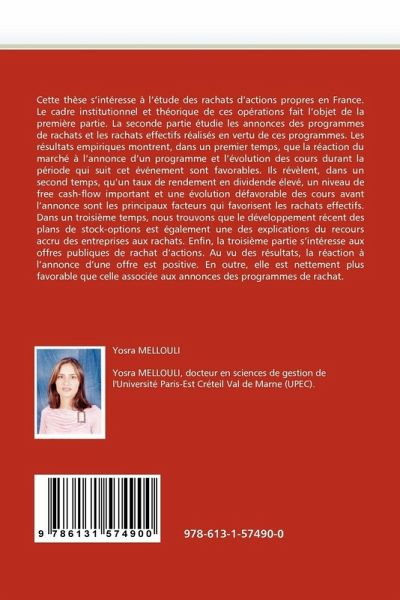 Cette thèse s'intéresse à l'étude des rachats d'actions propres en France. Le cadre institutionnel et théorique de ces opérations fait l'objet de la première partie. La seconde partie étudie les annonces des programmes de rachats et les rachats effectifs réalisés en vertu de ces programmes. Les résultats empiriques montrent, dans un premier temps, que la réaction du marché à l'annonce d'un programme et l'évolution des cours durant la période qui suit cet événement sont favorables. Ils révèlent, dans un second temps, qu'un taux de rendement en dividende élevé, un niveau de free cash-flow important et une évolution défavorable des cours avant l'annonce sont les principaux facteurs qui favorisent les rachats effectifs. Dans un troisième temps, nous trouvons que le développement récent des plans de stock-options est également une des explications du recours accru des entreprises aux rachats. Enfin, la troisième partie s'intéresse aux offres publiques de rachat d'actions. Au vu des résultats, la réaction à l'annonce d'une offre est positive. En outre, elle est nettement plus favorable que celle associée aux annonces des programmes de rachat.