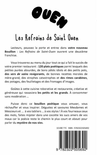 Le deuxième tome des Refrains de Saint-Ouen est un recueil de 120 poèmes. Il combine des comptines courtes pour enfants, des détournement de chansons, des petites strophes absurdes, des contes moraux et philosophiques pour adultes Entre autres genres ...Un patchwork plein de vitalité dans un écrin poétique classique. À consommer sans modération ...
