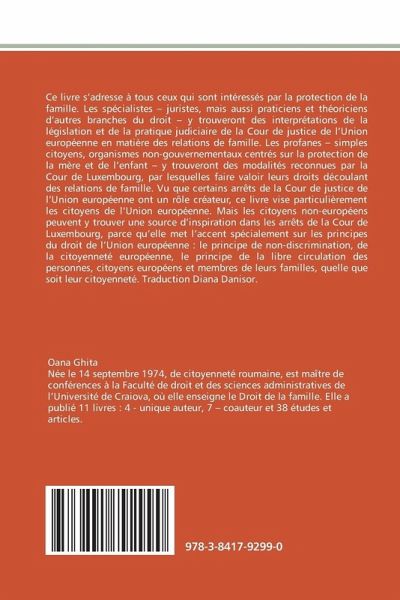 Ce livre s'adresse à tous ceux qui sont intéressés par la protection de la famille. Les spécialistes - juristes, mais aussi praticiens et théoriciens d'autres branches du droit - y trouveront des interprétations de la législation et de la pratique judiciaire de la Cour de justice de l'Union européenne en matière des relations de famille. Les profanes - simples citoyens, organismes non-gouvernementaux centrés sur la protection de la mère et de l'enfant - y trouveront des modalités reconnues par la Cour de Luxembourg, par lesquelles faire valoir leurs droits découlant des relations de famille. Vu que certains arrêts de la Cour de justice de l'Union européenne ont un rôle créateur, ce livre vise particulièrement les citoyens de l'Union européenne. Mais les citoyens non-européens peuvent y trouver une source d'inspiration dans les arrêts de la Cour de Luxembourg, parce qu'elle met l'accent spécialement sur les principes du droit de l'Union européenne : le principe de non-discrimination, de la citoyenneté européenne, le principe de la libre circulation des personnes, citoyens européens et membres de leurs familles, quelle que soit leur citoyenneté. Traduction Diana Danisor.