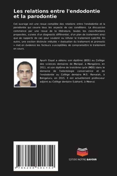 Cet ouvrage est une revue complète des relations entre l'endodontie et la parodontie qui couvre tous les aspects de ces conditions. La discussion commence par une revue de la littérature, toutes les classifications proposées, suivies d'un diagnostic différentiel, d'un plan de traitement ainsi que de rapports de cas pour soutenir ou réfuter le traitement spécifié. En outre, une section distincte intitulée « évaluation du traitement et pronostic » met en évidence les facteurs susceptibles de compromettre le traitement en cours.