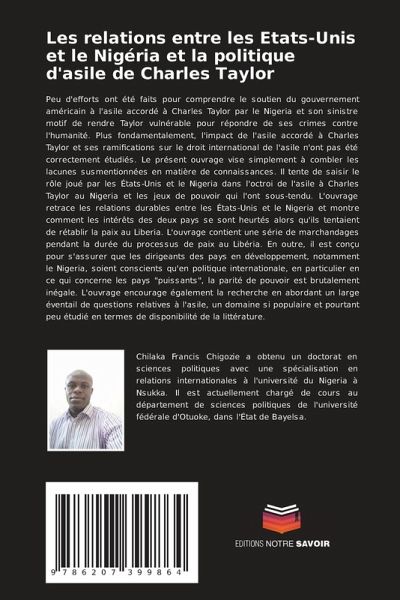 Peu d'efforts ont été faits pour comprendre le soutien du gouvernement américain à l'asile accordé à Charles Taylor par le Nigeria et son sinistre motif de rendre Taylor vulnérable pour répondre de ses crimes contre l'humanité. Plus fondamentalement, l'impact de l'asile accordé à Charles Taylor et ses ramifications sur le droit international de l'asile n'ont pas été correctement étudiés. Le présent ouvrage vise simplement à combler les lacunes susmentionnées en matière de connaissances. Il tente de saisir le rôle joué par les États-Unis et le Nigeria dans l'octroi de l'asile à Charles Taylor au Nigeria et les jeux de pouvoir qui l'ont sous-tendu. L'ouvrage retrace les relations durables entre les États-Unis et le Nigeria et montre comment les intérêts des deux pays se sont heurtés alors qu'ils tentaient de rétablir la paix au Liberia. L'ouvrage contient une série de marchandages pendant la durée du processus de paix au Libéria. En outre, il est conçu pour s'assurer que les dirigeants des pays en développement, notamment le Nigeria, soient conscients qu'en politique internationale, en particulier en ce qui concerne les pays "puissants", la parité de pouvoir est brutalement inégale. L'ouvrage encourage également la recherche en abordant un large éventail de questions relatives à l'asile, un domaine si populaire et pourtant peu étudié en termes de disponibilité de la littérature.