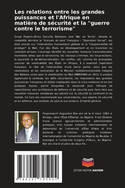 Great Powers-Africa Security Relations and 'War on Terror', dévoile la realpolitik derrière la "mission de paix" française - "Operation Serval", qui était ancrée sur l'intervention humanitaire globale et la "responsabilité de protéger" le Mali, l'un des États en développement et en transition du continent africain. L'ouvrage identifie les nouvelles menaces transnationales mondiales telles que le terrorisme, les réseaux criminels, les insurrections, la pauvreté, la dé-démocratisation, les conflits, etc. comme les principales sources de vulnérabilité des États en Afrique. Il a examiné l'opération française, le rôle de l'intervention d'une tierce partie, ainsi que les réalisations et les contraintes de la Mission multidimensionnelle intégrée des Nations unies pour la stabilisation au Mali (MINUSMA) en 2013. Il analyse également le contexte, les défis sécuritaires, les motivations des grandes puissances françaises et alliées impliquées dans la crise malienne et en tire quelques leçons, parmi lesquelles la nécessité pour l'Afrique de repositionner son architecture de défense et de sécurité pour faire face aux nouvelles menaces complexes qui pèsent sur la sécurité du continent et du monde. Ce livre est recommandé aux universitaires, aux experts en sécurité et en défense, aux instituts de paix et aux lecteurs d'intérêt général.