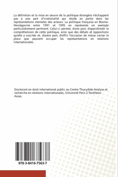 La définition et la mise en oeuvre de la politique étrangère n'échappent pas à une part d'irrationalité qui réside en partie dans les représentations mentales des acteurs. La politique française en Bosnie-Herzégovine entre 1991 et 1995 en représente un exemple particulièrement pertinent. Celui-ci permet, d'une part, d'approfondir la compréhension de cette politique, ainsi que des débats et oppositions qu'elle a suscités et, d'autre part, d'offrir l'occasion de mieux cerner la place que peuvent occuper les représentations en relations internationales.