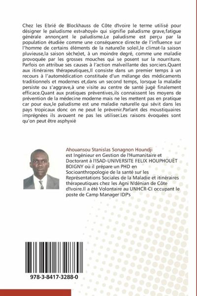 Chez les Ebrié de Blockhauss de Côte d'Ivoire le terme utilisé pour désigner le paludisme est"ahoyé" qui signifie paludisme grave,fatigue générale annonçant le paludisme.Le paludisme est perçu par la population étudiée comme une conséquence directe de l influence sur l homme de certains éléments de la nature(le soleil,le climat-la saison pluvieuse,la saison sèche)et, à un moindre degré, comme une maladie provoquée par les grosses mouches qui se posent sur la nourriture. Parfois on attribue ses causes à l action malveillante des sorciers.Quant aux itinéraires thérapeutiques,Il consiste dans un premier temps à un recours à l automédication constituée d un mélange des médicaments traditionnels et modernes et,dans un second temps, lorsque la maladie persiste ou s aggrave,à une visite au centre de santé jugé finalement efficace.Quant aux pratiques préventives,ils connaissent les moyens de prévention de la médecine moderne mais ne les mettent pas en pratique car pour eux,le paludisme est une maladie naturelle qui sévit dans les pays tropicaux donc on ne peut le prévenir.Parlant des moustiquaires imprégnées ils avouent ne pas les utiliser.Les raisons évoquées sont qu on peut être asphyxié