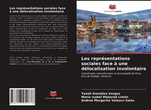 L'impact d'une catastrophe sur la santé publique est identifié à travers les éléments suivants : la production d'une surmortalité, d'une morbidité et d'une affectation de la population supérieures à ce qui est habituel dans la communauté affectée, la modification du schéma des maladies transmissibles et des risques environnementaux traditionnels dans cette communauté, l'impact sur le système de services de santé, dont la capacité d'action est mise à l'épreuve dans ce type de circonstances, les effets sur la santé mentale et le comportement humain, et les aspects de reconstruction, de relocalisation et de réhabilitation.Ce livre est composé de six chapitres de recherche montrant les aspects et les fondements des principaux concepts, ainsi qu'une analyse à partir de la communauté étudiée, qui fait partie d'un projet appelé "l'intervention du SEDESOL (Secrétariat du développement social) dans la reconstruction après une catastrophe", qui nous conduit à une analyse approfondie de la communauté Arroyo del Maíz, dans la municipalité de Poza Rica de Hidalgo, Veracruz, après une catastrophe naturelle sous la forme d'une inondation qui a conduit à une relocalisation involontaire.