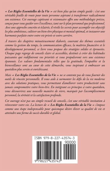 Les Règles Essentielles de la Vie est bien plus qu'un simple guide : c'est une véritable feuille de route pour toute personne aspirant à transformer radicalement son existence. Cet ouvrage captivant et visionnaire offre une méthodologie précise, conçue pour vous guider vers l'excellence, tant sur le plan personnel que professionnel. Avec une approche concrète et éclairée, il révèle les secrets pour accomplir vos objectifs les plus ambitieux, cultiver un bien-être physique et mental optimal, et instaurer une harmonie parfaite entre votre vie privée et votre carrière. À travers des chapitres minutieusement élaborés, couvrant des thèmes essentiels comme la gestion du temps, la communication efficace, la maîtrise financière et le développement personnel, ce livre vous propose des stratégies solides et éprouvées. Chaque page regorge de conseils clairs et accessibles, destinés à créer des habitudes puissantes qui redéfiniront vos priorités et vous propulseront vers une existence épanouie. Les valeurs fondamentales telles que la gratitude, l'empathie et la bienveillance sont au c¿ur de cette démarche, vous inspirant à embrasser un quotidien plus serein et enrichissant. Mais Les Règles Essentielles de la Vie ne se contente pas de vous fournir des outils de réussite personnelle. Il vous aide à surmonter les défis de la vie moderne avec des solutions pratiques, vous permettant d'améliorer votre productivité sans jamais compromettre votre bien-être. En intégrant ces principes à votre quotidien, vous découvrirez une nouvelle manière de vivre, marquée par l'accomplissement personnel, la sérénité et la satisfaction profonde. Cet ouvrage n'est pas un simple recueil de conseils, c'est une véritable invitation à réinventer votre vie. La lecture de Les Règles Essentielles de la Vie s'impose comme une étape indispensable pour quiconque désire élever sa qualité de vie et atteindre une forme de succès durable et global.