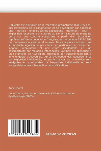 L objectif est d étudier de la mortalité prématurée (âge65 ans) des travailleurs de la construction et de développer par expertise une matrice emplois-tâches-expositions (Batimex) pour l exposition respiratoire et cutanée au ciment. L étude de mortalité porte sur une cohorte constituée à partir d un échantillon représentatif de la population française, sur la période 1974-1999 par comparaison externe et interne. Nos analyses montrent une surmortalité significative par cancer, en particulier par cancer de l appareil respiratoire et par chute accidentelle, et une sousmortalité par maladies infectieuses. Batimex est appliquée à un échantillon de 402 sujets interrogés par questionnaire lors d une enquête transversale. Après évaluation des questionnaires par expertise individuelle, les performances de la matrice sont analysées en comparaison à l expertise individuelle et sont acceptables après introduction de modifications.