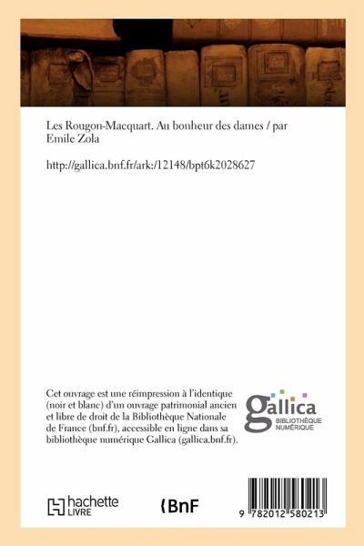 Les Rougon-Macquart. Au bonheur des dames / par Emile Zola Date de l'édition originale: 1883 Le présent ouvrage s'inscrit dans une politique de conservation patrimoniale des ouvrages de la littérature Française mise en place avec la BNF. HACHETTE LIVRE et la BNF proposent ainsi un catalogue de titres indisponibles, la BNF ayant numérisé ces oeuvres et HACHETTE LIVRE les imprimant à la demande. Certains de ces ouvrages reflètent des courants de pensée caractéristiques de leur époque, mais qui seraient aujourd'hui jugés condamnables. Ils n'en appartiennent pas moins à l'histoire des idées en France et sont susceptibles de présenter un intérêt scientifique ou historique. Le sens de notre démarche éditoriale consiste ainsi à permettre l'accès à ces oeuvres sans pour autant que nous en cautionnions en aucune façon le contenu. Pour plus d'informations, rendez-vous sur www.hachettebnf.fr