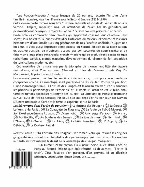 "Les Rougon-Macquart", vaste fresque de 20 romans, raconte l'histoire d'une famille imaginaire, vivant en France sous le Second Empire (1851-1870).Cette oeuvre porte comme sous titre "Histoire naturelle et sociale d'une famille sous le Second Empire, rappelant ainsi les ambitions de Zola:" Les Rougon-Macquart personnifieront l'époque, l'empire lui-même." Ce sera l'oeuvre principale de sa vie.Emile Zola va confronter deux familles qui apportent chacune leur caractère, leur secret, leur hérédité. Le but est d'étudier l'influence du milieu sur l'homme et les tares héréditaires d'une famille sur cinq générations depuis l'ancêtre Adélaïde Fouquet née en 1768. Il veut aussi dépeindre cette société du Second Empire de la façon la plus exhaustive possible, en n'oubliant aucune des composantes de cette société et en faisant une large place aux grandes transformations qui se produisirent à cette époque (urbanisme parisien, grands magasins, développement du chemin de fer, apparition du syndicalisme moderne, etc.)Cet ensemble de romans marque le triomphe du mouvement littéraire appelé naturalisme, don t Zola est avec Edmond et Jules de Goncourt, puis Guy De Maupassant, le principal représentant.Les romans peuvent se lire de manière indépendante, mais, pour une meilleure compréhension de la chronologie, il est préférable de les lire dans l'ordre de parution. D'une manière générale, La Fortune des Rougon est le roman d'ouverture qui annonce les principaux personnages de l'ensemble et Le Docteur Pascal en est le bilan final. Certains romans apparaissent comme des "suites": La Conquête de Plassans débouche sur La Faute de l'Abbé Mouret; Pot-Bouille se prolonge par Au Bonheur des Dames; L'Argent prolonge La Curée et la terre se continue par La Débâcle.Résumé Tome 1:"La Fortune des Rougon": 1er roman: celui qui retrace les origines géographiques, sociales et familiales des personnages qui animeront les romans suivants. Ce livre marque le début de la Généalogie des Rougon-Macquart."La Curée": 2ème roman qui a pour thème la vie débauchée de Paris au Second Empire que Zola résume en deux mots: "l'or et la chair". C'est l'histoire d'un parvenu, d'un pervers, ici un affairiste politique, désireux de réussir à tout prix...........
