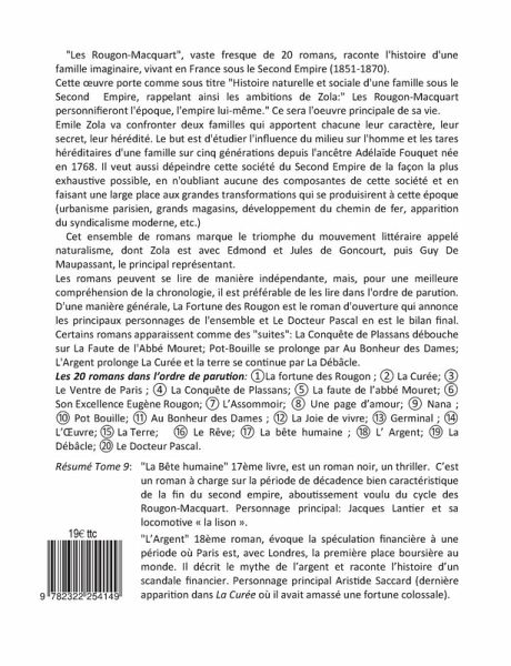 Les Rougon-Macquart", vaste fresque de 20 romans, raconte l'histoire d'une famille imaginaire, vivant en France sous le Second Empire (1851-1870).Cette oeuvre porte comme sous titre "Histoire naturelle et sociale d'une famille sous le Second Empire, rappelant ainsi les ambitions de Zola:" Les Rougon-Macquart personnifieront l'époque, l'empire lui-même." Ce sera l'oeuvre principale de sa vie.Emile Zola va confronter deux familles qui apportent chacune leur caractère, leur secret, leur hérédité. Le but est d'étudier l'influence du milieu sur l'homme et les tares héréditaires d'une famille sur cinq générations depuis l'ancêtre Adélaïde Fouquet née en 1768. Il veut aussi dépeindre cette société du Second Empire de la façon la plus exhaustive possible, en n'oubliant aucune des composantes de cette société et en faisant une large place aux grandes transformations qui se produisirent à cette époque (urbanisme parisien, grands magasins, développement du chemin de fer, apparition du syndicalisme moderne, etc.)Cet ensemble de romans marque le triomphe du mouvement littéraire appelé naturalisme, don t Zola est avec Edmond et Jules de Goncourt, puis Guy De Maupassant, le principal représentant.Les romans peuvent se lire de manière indépendante, mais, pour une meilleure compréhension de la chronologie, il est préférable de les lire dans l'ordre de parution. D'une manière générale, La Fortune des Rougon est le roman d'ouverture qui annonce les principaux personnages de l'ensemble et Le Docteur Pascal en est le bilan final. Certains romans apparaissent comme des "suites": La Conquête de Plassans débouche sur La Faute de l'Abbé Mouret; Pot-Bouille se prolonge par Au Bonheur des Dames; L'Argent prolonge La Curée et la terre se continue par La Débâcle.Résumé Tome 9:"La Bête Humaine", 17ème livre, est un roman noir, un thriller. C'est un roman à charge sur la période de décadence bien caractéristique de la fin du Second Empire, aboutissement voulu du cycle des Rougon-Macquart.Personnage principal: Jacques Lantier et sa locomotive "la lison"."L'Argent", 18ème roman, évoque la spéculation financière à une période où Paris est, avec Londres, la première place boursière au monde. Il décrit le mythe de l'argent et raconte l'histoire d'un scandale financier.Personnage principal Aristide Saccard (dernière apparition dans La Curée où il avait amassé une fortune colossale).