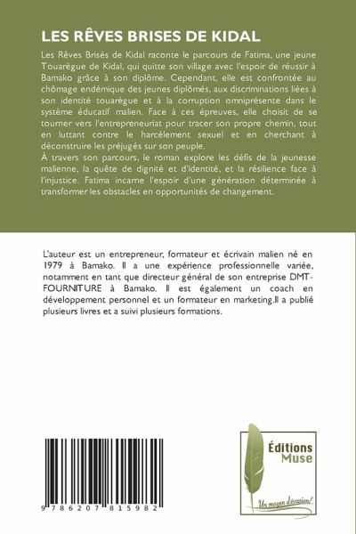 Les Rêves Brisés de Kidal raconte le parcours de Fatima, une jeune Touarègue de Kidal, qui quitte son village avec l'espoir de réussir à Bamako grâce à son diplôme. Cependant, elle est confrontée au chômage endémique des jeunes diplômés, aux discriminations liées à son identité touarègue et à la corruption omniprésente dans le système éducatif malien. Face à ces épreuves, elle choisit de se tourner vers l'entrepreneuriat pour tracer son propre chemin, tout en luttant contre le harcèlement sexuel et en cherchant à déconstruire les préjugés sur son peuple.À travers son parcours, le roman explore les défis de la jeunesse malienne, la quête de dignité et d'identité, et la résilience face à l'injustice. Fatima incarne l'espoir d'une génération déterminée à transformer les obstacles en opportunités de changement.