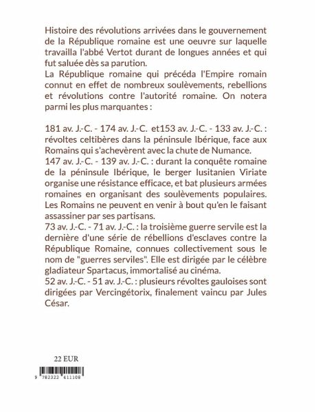 Histoire des révolutions arrivées dans le gouvernement de la République romaine est une oeuvre sur laquelle travailla l'abbé Vertot durant de longues années et qui fut saluée dès sa parution. La République romaine qui précéda l'Empire romain connut en effet de nombreux soulèvements, rebellions et révolutions contre l'autorité romaine. On notera parmi les plus marquantes : 181 av. J.-C. - 174 av. J.-C. et153 av. J.-C. - 133 av. J.-C. : révoltes celtibères dans la péninsule Ibérique, face aux Romains qui s'achevèrent avec la chute de Numance.147 av. J.-C. - 139 av. J.-C. : durant la conquête romaine de la péninsule Ibérique, le berger lusitanien Viriate organise une résistance efficace, et bat plusieurs armées romaines en organisant des soulèvements populaires. Les Romains ne peuvent en venir à bout qu'en le faisant assassiner par ses partisans.73 av. J.-C. - 71 av. J.-C. : la troisième guerre servile est la dernière d'une série de rébellions d'esclaves contre la République Romaine, connues collectivement sous le nom de "guerres serviles". Elle est dirigée par le célèbre gladiateur Spartacus, immortalisé au cinéma.52 av. J.-C. - 51 av. J.-C. : plusieurs révoltes gauloises sont dirigées par Vercingétorix, finalement vaincu par Jules César.
