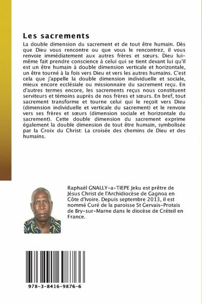 La double dimension du sacrement et de tout être humain. Dès que Dieu vous rencontre ou que vous le rencontrez, il vous renvoie immédiatement aux autres frères et s urs. Dieu lui-même fait prendre conscience à celui qui se tient devant lui qu'il est un être humain à double dimension verticale et horizontale, un être tourné à la fois vers Dieu et vers les autres humains. C'est cela que j'appelle la double dimension individuelle et sociale, mieux encore ecclésiale ou missionnaire du sacrement reçu. En d'autres termes encore, les sacrements reçus nous constituent serviteurs et témoins auprès de nos frères et s urs. En bref, tout sacrement transforme et tourne celui qui le reçoit vers Dieu (dimension individuelle et verticale du sacrement) et le renvoie vers ses frères et s urs (dimension sociale et horizontale du sacrement). Cette double dimension du sacrement exprime également la double dimension de tout être humain, symbolisée par la Croix du Christ: La croisée des chemins de Dieu et des humains.