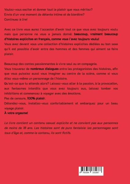 Voulez-vous exciter et donner tout le plaisir que vous méritez?Envie d'un vrai moment de détente intime et de bienêtre?Continuez à lire!Avec ce livre vous aurez l'occasion d'avoir tout ce que vous avez toujours voulu mais que personne ne vous a jamais donné: beaucoup, vraiment beaucoup d'histoires explicites en français, comme vous l'avez toujours voulu!Vous avez devant vous une collection d'histoires explicites dédiées au bon sexe qu'il est possible d'avoir entre des hommes et des femmes qui aiment se faire plaisir. Beaucoup des contes passionnantes à vivre seul ou en compagnie.Vous trouverez de nombreux dialogues entre les protagonistes des histoires, afin que vous puissiez aussi vous imaginer au centre de la scène, comme si vous étiez vous-même un personnage de l'histoire.Qu'est-ce que tu attends alors? Laissez-vous aller à la passion, à la provocation, aux fantasmes interdits que vous avez toujours eus, laissez tomber vos inhibitions et commencez à voyager avec des émotions.Pas de censure, 100 pour 100 de plaisir.Détendez-vous, installez-vous confortablement et embarquez pour un beau voyage plaisir.À votre orgasme!