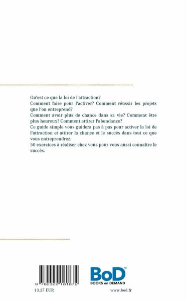 Qu'est ce que la loi de l'attraction?Comment faire pour l'activer? Comment réussir les projets que l'on entreprend?Comment avoir plus de chance dans sa vie? Comment être plus heureux? Comment attirer l'abondance?Ce guide simple vous guidera pas à pas pour activer la loi de l'attraction et attirer la chance et le succès dans tout ce que vous entreprendrez.50 exercices à réaliser chez vous pour vous aussi connaître le succès.