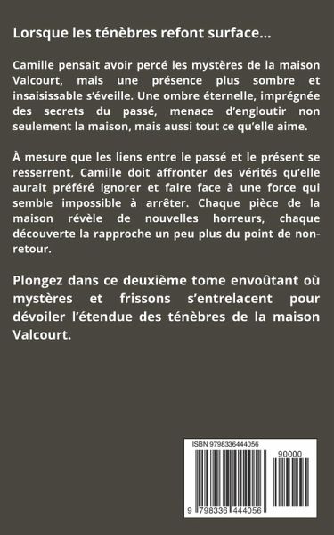 LES SECRETS DE LA MAISON VALCOURT: L'ombre éternelle Disponible en formats Kindle, broché et relié. Dans ce deuxième volet de la trilogie Les Secrets de la Maison Valcourt, intitulé L'Ombre Éternelle, Camille plonge plus profondément dans les mystères de la maison familiale. Après les révélations troublantes de L'Héritage Oublié, elle découvre que les forces obscures qui hantent la demeure sont liées à des pactes oubliés et des alliances séculaires scellées il y a des siècles. Camille explore des archives ancestrales et exhume des vérités enfouies qui remettent en question tout ce qu'elle pensait savoir sur sa famille. Mais chaque nouvelle révélation s'accompagne de conséquences imprévisibles. L'ombre, bien plus qu'un simple écho du passé, révèle son influence sur le présent et menace de bouleverser le destin des Valcourt. Alors que les tensions s'intensifient, Camille est confrontée à des choix déchirants: protéger les secrets du passé pour préserver la mémoire familiale ou tout révéler au risque de libérer une force qui pourrait tout détruire. Les alliances se brisent, la maison devient un champ de bataille, et Camille doit affronter une ombre plus vivante et puissante qu'elle n'aurait jamais imaginé. L'ombre éternelle est un thriller captivant mêlant mystère historique, suspense psychologique et ambiance sombre. Ce deuxième tome intensifie l'intrigue et rapproche Camille de la vérité, tout en l'entraînant au bord du danger. Pourquoi lire ce livre ? * Thriller à suspense: Une tension croissante à chaque révélation. * Mystère historique: Des secrets ancestraux qui influencent le présent. * Romans noirs: Une atmosphère sombre et oppressante qui captive. Commandez dès maintenant L'Ombre Éternelle en formats Kindle, broché ou relié, et laissez-vous emporter par ce second tome palpitant qui vous tiendra en haleine jusqu'à la dernière page.