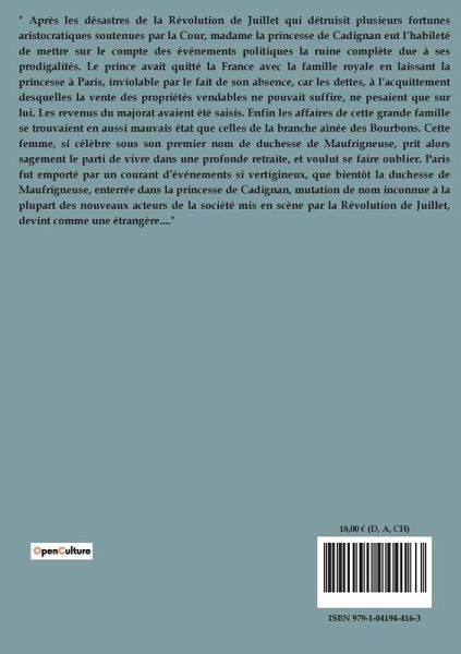 " Après les désastres de la Révolution de Juillet qui détruisit plusieurs fortunes aristocratiques soutenues par la Cour, madame la princesse de Cadignan eut l¿habileté de mettre sur le compte des événements politiques la ruine complète due à ses prodigalités. Le prince avait quitté la France avec la famille royale en laissant la princesse à Paris, inviolable par le fait de son absence, car les dettes, à l¿acquittement desquelles la vente des propriétés vendables ne pouvait suffire, ne pesaient que sur lui. Les revenus du majorat avaient été saisis. Enfin les affaires de cette grande famille se trouvaient en aussi mauvais état que celles de la branche aînée des Bourbons. Cette femme, si célèbre sous son premier nom de duchesse de Maufrigneuse, prit alors sagement le parti de vivre dans une profonde retraite, et voulut se faire oublier. Paris fut emporté par un courant d¿événements si vertigineux, que bientôt la duchesse de Maufrigneuse, enterrée dans la princesse de Cadignan, mutation de nom inconnue à la plupart des nouveaux acteurs de la société mis en scène par la Révolution de Juillet, devint comme une étrangère...."