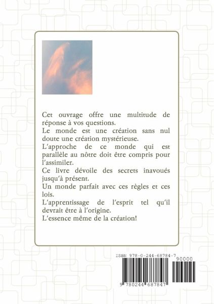 Cet ouvrage offre une multitude de réponse à vos questions. Le monde est une création sans nul doute une création mystérieuse. L'approche de ce monde qui est parallèle au nôtre doit être compris pour l'assimiler. Ce livre dévoile des secrets inavoués jusqu'à présent. Un monde parfait avec ces règles et ces lois. L'apprentissage de l'esprit tel qu'il devrait être à l'origine. L'essence même de la création!