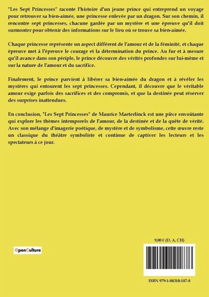 "Les Sept Princesses" raconte l'histoire d'un jeune prince qui entreprend un voyage pour retrouver sa bien-aimée, une princesse enlevée par un dragon. Sur son chemin, il rencontre sept princesses, chacune gardée par un mystère et une épreuve qu'il doit surmonter pour obtenir des informations sur le lieu où se trouve sa bien-aimée. Chaque princesse représente un aspect différent de l'amour et de la féminité, et chaque épreuve met à l'épreuve le courage et la détermination du prince. Au fur et à mesure qu'il avance dans son périple, le prince découvre des vérités profondes sur lui-même et sur la nature de l'amour et du sacrifice. Finalement, le prince parvient à libérer sa bien-aimée du dragon et à révéler les mystères qui entourent les sept princesses. Cependant, il découvre que le véritable amour exige parfois des sacrifices et des compromis, et que la destinée peut réserver des surprises inattendues. En conclusion, "Les Sept Princesses" de Maurice Maeterlinck est une pièce envoûtante qui explore les thèmes intemporels de l'amour, de la destinée et de la quête de vérité. Avec son mélange d'imagerie poétique, de mystère et de symbolisme, cette ¿uvre reste un classique du théâtre symboliste et continue de captiver les lecteurs et les spectateurs à ce jour.