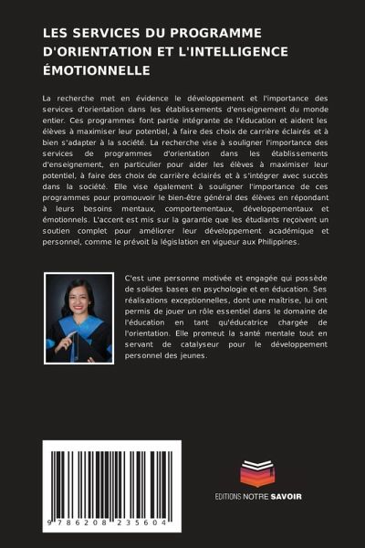 La recherche met en évidence le développement et l'importance des services d'orientation dans les établissements d'enseignement du monde entier. Ces programmes font partie intégrante de l'éducation et aident les élèves à maximiser leur potentiel, à faire des choix de carrière éclairés et à bien s'adapter à la société. La recherche vise à souligner l'importance des services de programmes d'orientation dans les établissements d'enseignement, en particulier pour aider les élèves à maximiser leur potentiel, à faire des choix de carrière éclairés et à s'intégrer avec succès dans la société. Elle vise également à souligner l'importance de ces programmes pour promouvoir le bien-être général des élèves en répondant à leurs besoins mentaux, comportementaux, développementaux et émotionnels. L'accent est mis sur la garantie que les étudiants reçoivent un soutien complet pour améliorer leur développement académique et personnel, comme le prévoit la législation en vigueur aux Philippines.