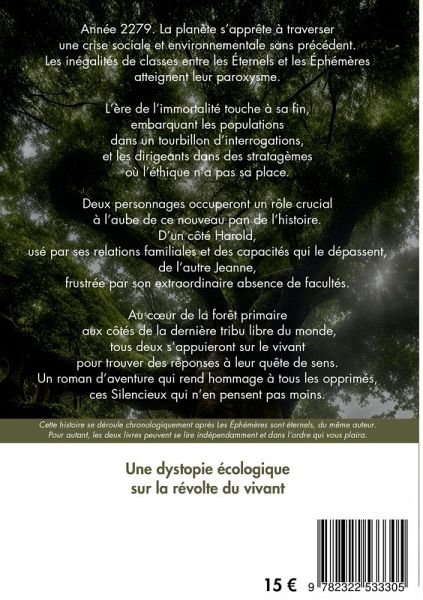Année 2279. La planète s'apprête à traverser une crise sociale et environnementale sans précédent. Les inégalités de classe entre les Éternels et les Éphémères atteignent leur paroxysme. L'ère de l'immortalité touche à sa fin, embarquant les populations dans un tourbillon d'interrogations, et les dirigeants dans des stratagèmes où l'éthique n'a pas sa place. Deux personnages occuperont un rôle crucial à l'aube de ce nouveau pan de l'histoire. D'un côté Harold, usé par ses relations familiales et des capacités qui le dépassent, de l'autre Jeanne, frustrée par son extraordinaire absence de facultés. Au coeur de la forêt primaire aux côtés de la dernière tribu libre du monde, tous deux s'appuieront sur le vivant pour trouver des réponses à leur quête de sens. Un roman d'aventure qui rend hommage à tous les opprimés, ces Silencieux qui n'en pensent pas moins.