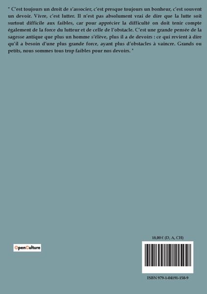 " C¿est toujours un droit de s¿associer, c¿est presque toujours un bonheur, c¿est souvent un devoir. Vivre, c¿est lutter. Il n¿est pas absolument vrai de dire que la lutte soit surtout difficile aux faibles, car pour apprécier la difficulté on doit tenir compte également de la force du lutteur et de celle de l¿obstacle. C¿est une grande pensée de la sagesse antique que plus un homme s¿élève, plus il a de devoirs : ce qui revient à dire qüil a besoin d¿une plus grande force, ayant plus d¿obstacles à vaincre. Grands ou petits, nous sommes tous trop faibles pour nos devoirs. "