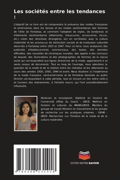 L'objectif de ce livre est de comprendre la présence des modes françaises et américaines dans les tenues et les modes vestimentaires des femmes de l'élite de Fortaleza, et comment l'adoption de styles, de tendances et d'éléments vestimentaires (vêtements, chaussures, accessoires, tissus, etc.) selon des directives étrangères est en corrélation avec la culture matérielle et les processus de distinction sociale et de traduction culturelle observés à Fortaleza entre 1925 et 1947. Pour ce faire, nous analysons des publicités d'établissements commerciaux, des textes, des données officielles, des nouvelles de chroniques sociales, des appels à des concours de beauté, des illustrations et des photographies de femmes de la classe aisée qui correspondent aux lignes directrices de la mode, appartenant à un vaste corpus de documents. Tout au long de l'ouvrage, nous abordons la question de la mode et de la relation entre les individus et les vêtements au cours des années 1920, 1930, 1940 et avant. Nous étudions ici l'expérience de la mode française, nord-américaine et de Fortaleza destinée au public féminin correspondant à cette période, tout en tissant un lien entre celle-ci et l'univers des événements, à l'échelle macro, qui l'ont considérablement influencée.
