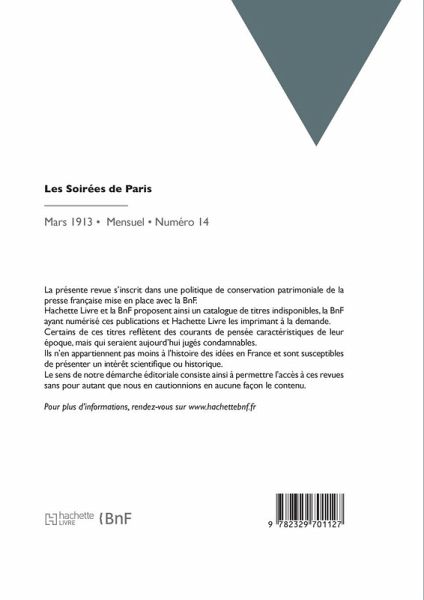 Les Soirées de Paris: recueil mensuel Date de l'édition originale: 1913-03 La présente revue s'inscrit dans une politique de conservation patrimoniale de la presse française mise en place avec la BnF. Hachette Livre et la BnF proposent ainsi un catalogue de titres indisponibles, la BnF ayant numérisé ces publications et Hachette Livre les imprimant à la demande. Certains de ces titres reflètent des courants de pensée caractéristiques de leur époque, mais qui seraient aujourd'hui jugés condamnables. Ils n'en appartiennent pas moins à l'histoire des idées en France et sont susceptibles de présenter un intérêt scientifique ou historique. Le sens de notre démarche éditoriale consiste ainsi à permettre l'accès à ces revues sans pour autant que nous en cautionnions en aucune façon le contenu. Pour plus d'informations, rendez-vous sur www.hachettebnf.fr