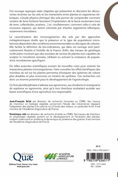 Cet ouvrage regroupe seize chapitres qui présentent et discutent les découvertes récentes sur les sols et les interactions entre plantes et organismes telluriques. L'étude physico-chimique des sols permet de comprendre comment certains de leurs horizons favorisent l'implantation de la faune souterraine (vers de terre, collemboles, acariens...) et, corollairement, comment celle-ci crée de nouveaux espaces, qui seront colonisés par d'autres organismes telluriques, notamment microbiens.La caractérisation des microorganismes des sols par des approches métagénomiques révèle que la présence et le type de populations microbiennes dépendent des conditions environnementales ou des types de cultures. Elle facilite la définition de bio-indicateurs, qui dans cet ouvrage sont particulièrement illustrés à l'échelle de la France. Enfin, des travaux de génétique moléculaire montrent que des exsudats de racines de plantes sont capables de sculpter le microbiote racinaire, inhibant ou activant la croissance de populations microbiennes spécifiques.De telles avancées scientifiques ouvrent de nouvelles voies pour orienter les interactions plantes-microorganismes. Faire connaître les effets bénéfiques des microbes du sol sur les plantes permettra d'instaurer des systèmes de culture plus durables et plus économes en intrants de synthèse. Ces recherches ont donc un énorme potentiel pour le développement de l'agroécologie.Ce livre pluridisciplinaire s'adresse aux agronomes, aux étudiants et enseignants du supérieur en agronomie, ainsi qu'à tout chercheur souhaitant accéder aux bases scientifiques d'une agriculture écoresponsable.
