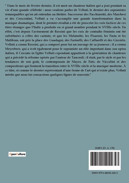 " Dans le mois de février dernier, il est mort un chanteur italien qui a joui pendant sa vie d¿une grande célébrité : nous voulons parler de Velluti, le dernier des sopranistes remarquables qüon ait entendus au théâtre. Successeur des Pacchiarotti, des Marchesi et des Crescentini, Velluti a vu s¿accomplir une grande transformation dans la musique dramatique, dont le premier résultat a été de proscrire les voix factices de ces êtres étranges que l¿Italie a produits en si grand nombre pendant le XVIIIe siècle. En effet, c¿est depuis l¿avènement de Rossini que les voix de contralto féminin ont été substituées à celles des castrats, et que les Molanotte, les Pisaroni, les Pasta et les Malibran, ont pris la place des Guadagni, des Farinelli, des Caffarelli et des Gizzielo. Velluti a connu Rossini, qui a composé pour lui un ouvrage de sa jeunesse ; il a connu Meyerbeer, qui a écrit également pour le sopraniste un rôle important dans son opéra italien, il Crociato in Egitto Velluti cependant appartient à la génération de chanteurs qui a précédé la réforme opérée par l¿auteur de Tancredi ; il était, par le style et par les tendances de son goût, le contemporain de Mayer, de Paër, de Niccolini et des compositeurs qui forment la transition entre le XVIIIe siècle et la musique moderne. À ce titre, et comme le dernier représentant d¿une forme de l¿art qui n¿existe plus, Velluti mérite que nous lui consacrions quelques lignes de souvenir."