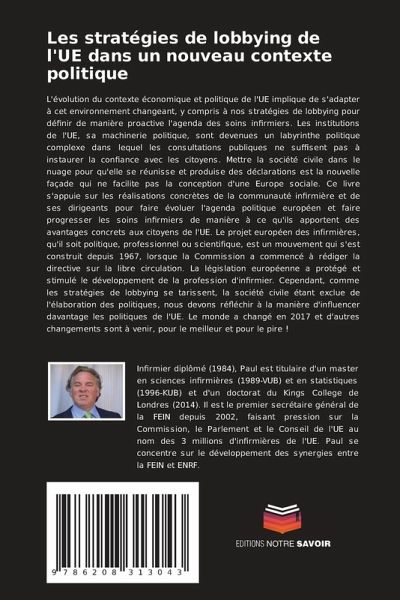 L'évolution du contexte économique et politique de l'UE implique de s'adapter à cet environnement changeant, y compris à nos stratégies de lobbying pour définir de manière proactive l'agenda des soins infirmiers. Les institutions de l'UE, sa machinerie politique, sont devenues un labyrinthe politique complexe dans lequel les consultations publiques ne suffisent pas à instaurer la confiance avec les citoyens. Mettre la société civile dans le nuage pour qu'elle se réunisse et produise des déclarations est la nouvelle façade qui ne facilite pas la conception d'une Europe sociale. Ce livre s'appuie sur les réalisations concrètes de la communauté infirmière et de ses dirigeants pour faire évoluer l'agenda politique européen et faire progresser les soins infirmiers de manière à ce qu'ils apportent des avantages concrets aux citoyens de l'UE. Le projet européen des infirmières, qu'il soit politique, professionnel ou scientifique, est un mouvement qui s'est construit depuis 1967, lorsque la Commission a commencé à rédiger la directive sur la libre circulation. La législation européenne a protégé et stimulé le développement de la profession d'infirmier. Cependant, comme les stratégies de lobbying se tarissent, la société civile étant exclue de l'élaboration des politiques, nous devons réfléchir à la manière d'influencer davantage les politiques de l'UE. Le monde a changé en 2017 et d'autres changements sont à venir, pour le meilleur et pour le pire !
