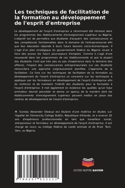 Le développement de l'esprit d'entreprise a récemment été introduit dans les programmes des établissements d'enseignement supérieur au Nigeria. L'objectif est de permettre aux étudiants d'acquérir des connaissances et des compétences fonctionnelles dans le domaine de l'entrepreneuriat afin que leur éducation réponde à leurs futurs besoins socio-économiques. Il s'agit d'un plan stratégique du gouvernement fédéral du Nigeria visant à faire des jeunes les futurs pourvoyeurs d'emplois. Comme il s'agit d'une nouveauté dans les programmes de ces établissements et que la plupart des étudiants n'ont que très peu ou pas d'expérience dans le domaine des affaires, l'impact des connaissances entrepreneuriales sur ces étudiants nécessitera une approche soigneusement planifiée. L'approche de la facilitation. Ce livre sur les techniques de facilitation de la formation au développement de l'esprit d'entreprise se concentre sur les techniques à appliquer par les formateurs en développement de l'esprit d'entreprise afin de renforcer et de maintenir l'intérêt des étudiants pour la formation à l'esprit d'entreprise. Il met également en évidence les qualités qu'un futur animateur devrait posséder et donne un aperçu de la manière dont les établissements d'enseignement supérieur peuvent mettre en place des centres de développement de l'esprit d'entreprise.