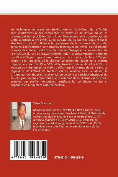 Les techniques culturales en céréaliculture au Nord-Ouest de la Tunisie sont confrontées à des contraintes de climat et de nature du sol et rencontrent des problèmes technique, énergétique et agro-pédologique. Cette spécificité a des effets sur la préparation du sol et le semis et sur la structure du sol et influence le rendement de la culture et le prix des céréales. L'introduction de nouvelles techniques de travail du sol permet l'amélioration de la production, l'économie d'énergie et la conservation de la structure du sol. Le travail combiné réduit la consommation d'énergie de 18 à 48% par rapport aux itinéraires du chisel et de 34 à 50% par rapport aux itinéraires de la charrue. Le temps de labour de la charrue dépasse le chisel de 39 à 51% et le travail combiné de 79 à 87%. La traction du chisel nécessite moins d'effort que la charrue de 28 à 65%. La régression de l'effort de traction est en relation avec la vitesse, la profondeur du labour et l'état physique du sol. Les variables physiques du sol et agronomiques montrent que le combiné de la charrue ou du chisel entraîne des profils homogènes, améliore les conditions du sol et engendre un rendement cultural meilleur.