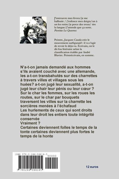 NÕa-t-on jamais demand¿ aux hommes sÕils avaient couch¿ avec une allemande, les a-t-on transbahut¿s sur des charrettes ¿ travers villes et villages sous les hües ? a-t-on jug¿ leur sexualit¿, a-t-on jug¿ leur chair leur p¿nis ou leur cÏur ? Sur le char les femmes, sur les roues les routes, sur le char par bouquets traversent les villes sur la charrette les sorci?res men¿es ¿ lÕ¿chafaud Les hurlements de ceux qui sont droits dans leur droit les entiers toute int¿grit¿ conserv¿e Vraiment ? Certaines deviennent folles le temps de la tonte certaines deviennent plus fortes le temps de la honte