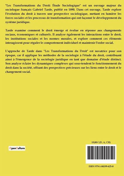 "Les Transformations du Droit: Étude Sociologique" est un ouvrage majeur du sociologue français Gabriel Tarde, publié en 1890. Dans cet ouvrage, Tarde explore l'évolution du droit à travers une perspective sociologique, mettant en lumière les forces sociales et les processus de transformation qui ont façonné le développement du système juridique. Tarde examine comment le droit émerge et évolue en réponse aux changements sociaux, économiques et culturels. Il analyse également les interactions entre le droit, les institutions sociales et les normes morales, et explore comment ces éléments interagissent pour réguler le comportement individuel et maintenir l'ordre social. L'approche de Tarde dans "Les Transformations du Droit" est novatrice pour son époque, car il applique les méthodes de la sociologie à l'étude du droit, contribuant ainsi à l'émergence de la sociologie juridique en tant que domaine d'étude distinct. Son analyse éclaire les dynamiques complexes qui sous-tendent le fonctionnement du droit dans la société, offrant des perspectives précieuses sur les liens entre le droit et le changement social.