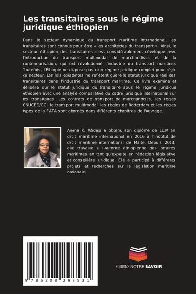 Dans le secteur dynamique du transport maritime international, les transitaires sont connus pour être « les architectes du transport ». Ainsi, le secteur éthiopien des transitaires s'est considérablement développé avec l'introduction du transport multimodal de marchandises et de la conteneurisation, qui ont révolutionné l'industrie du transport maritime. Toutefois, l'Éthiopie ne dispose pas d'un régime juridique complet pour régir ce secteur. Les lois existantes ne reflètent guère le statut juridique réel des transitaires dans l'industrie du transport maritime. Ce livre examine et délibère sur le statut juridique du transitaire sous le régime juridique éthiopien avec une analyse comparative du cadre juridique international sur les transitaires. Les contrats de transport de marchandises, les règles CNUCED/CCI, le transport multimodal, les règles de Rotterdam et les règles types de la FIATA sont abordés dans différents chapitres de l'ouvrage.