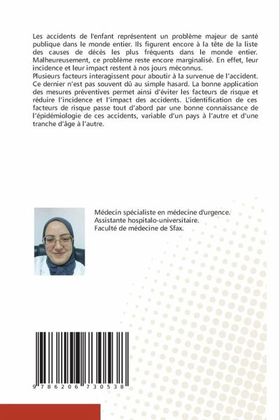 Les accidents de l'enfant représentent un problème majeur de santé publique dans le monde entier. Ils figurent encore à la tête de la liste des causes de décès les plus fréquents dans le monde entier. Malheureusement, ce problème reste encore marginalisé. En effet, leur incidence et leur impact restent à nos jours méconnus.Plusieurs facteurs interagissent pour aboutir à la survenue de l'accident. Ce dernier n'est pas souvent dû au simple hasard. La bonne application des mesures préventives permet ainsi d'éviter les facteurs de risque et réduire l'incidence et l'impact des accidents. L'identification de ces facteurs de risque passe tout d'abord par une bonne connaissance de l'épidémiologie de ces accidents, variable d'un pays à l'autre et d'une tranche d'âge à l'autre.