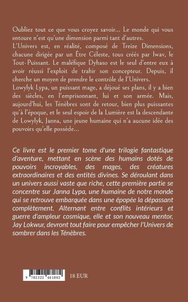 Oubliez tout ce que vous croyez savoir... Le monde qui vous entoure n'est qu'une dimension parmi tant d'autres.L'Univers est, en réalité, composé de Treize Dimensions, chacune dirigée par un Être Céleste, tous créés par Iwav, le Tout-Puissant. Le maléfique Dyhaso est le seul d'entre eux à avoir réussi l'exploit de trahir son concepteur. Depuis, il cherche un moyen de prendre le contrôle de l'Univers.Lowylyk Lypa, un puissant mage, a déjoué ses plans, il y a bien des siècles, en l'emprisonnant, lui et son armée. Mais, aujourd'hui, les Ténèbres sont de retour, bien plus puissantes qu'à l'époque, et le seul espoir de la Lumière est la descendante de Lowylyk, Janna, une jeune humaine qui n'a aucune idée des pouvoirs qu'elle possède...Ce livre est le premier tome d'une trilogie fantastique d'aventure, mettant en scène des humains dotés de pouvoirs incroyables, des mages, des créatures extraordinaires et des entités divines. Se déroulant dans un univers aussi vaste que riche, cette première partie se concentre sur Janna Lypa, une humaine de notre monde qui se retrouve embarquée dans une épopée la dépassant complètement. Alternant entre conflits intérieurs et guerre d'ampleur cosmique, elle et son nouveau mentor, Jay Lokwur, devront tout faire pour empêcher l'Univers de sombrer dans les Ténèbres.