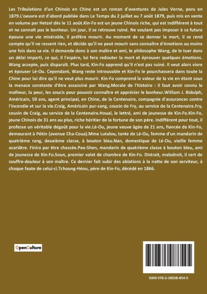 Les Tribulations d'un Chinois en Chine est un roman d'aventures de Jules Verne, paru en 1879.L'oeuvre est d'abord publiée dans Le Temps du 2 juillet au 7 août 1879, puis mis en vente en volume par Hetzel dès le 11 août.Kin-Fo est un jeune Chinois riche, qui est indifférent à tout et ne connaît pas le bonheur. Un jour, il se retrouve ruiné. Ne voulant pas imposer à sa future épouse une vie misérable, il préfère mourir. Au moment de se donner la mort, il se rend compte qu'il ne ressent rien, et décide qu'il ne peut mourir sans connaître d'émotions au moins une fois dans sa vie. Il demande donc à son maître et ami, le philosophe Wang, de le tuer dans un délai imparti, ce qui, il l'espère, lui fera redouter la mort et éprouver quelques émotions. Wang accepte, puis disparaît. Plus tard, Kin-Fo apprend qu'il n'est pas ruiné. Il veut alors vivre et épouser Lé-Ou. Cependant, Wang reste introuvable et Kin-Fo le pourchassera dans toute la Chine pour lui dire qu'il ne veut plus mourir. Kin-Fo comprend la valeur de la vie en étant sous la menace constante d'être assassiné par Wang.Morale de l'histoire : il faut avoir connu le malheur, la peur, les soucis pour pouvoir connaître et apprécier le bonheur.William J. Bidulph, Américain, 50 ans, agent principal, en Chine, de la Centenaire, compagnie d'assurances contre l'incendie et sur la vie.Craig, Américain pur-sang, cousin de Fry, au service de la Centenaire.Fry, cousin de Craig, au service de la Centenaire.Houal, le lettré, ami de jeunesse de Kin-Fo.Kin-Fo, jeune Chinois de 31 ans au plus, riche héritier de la fortune de son père. Indifférent pour tout, il professe un véritable dégoût pour la vie.Lé-Ou, jeune veuve âgée de 21 ans, fiancée de Kin-Fo, demeurant à Pékin (avenue Cha-Coua).Mme Lutalou, tante de Lé-Ou, femme d'un mandarin de quatrième rang, deuxième classe, à bouton bleu.Nan, domestique de Lé-Ou, vieille femme acariâtre. Finira par être chassée.Pao-Shen, mandarin de quatrième classe à bouton bleu, ami de jeunesse de Kin-Fo.Soun, premier valet de chambre de Kin-Fo. Distrait, maladroit, il sert de souffre-douleur à son maître. Ce dernier fait subir des ablations à la natte de son serviteur, à chaque faute de celui-ci.Tchoung-Héou, père de Kin-Fo, décédé en 1866.