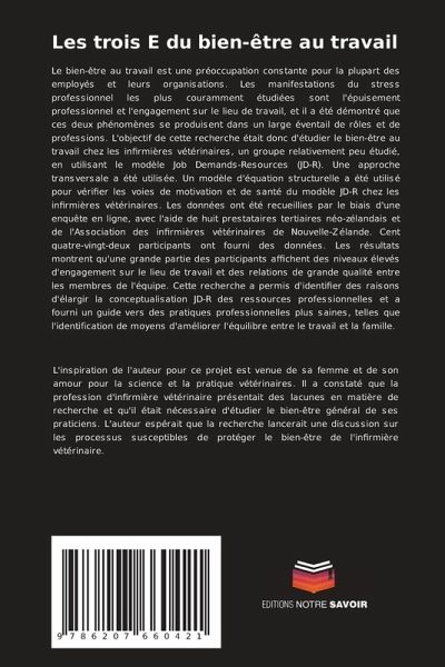 Le bien-être au travail est une préoccupation constante pour la plupart des employés et leurs organisations. Les manifestations du stress professionnel les plus couramment étudiées sont l'épuisement professionnel et l'engagement sur le lieu de travail, et il a été démontré que ces deux phénomènes se produisent dans un large éventail de rôles et de professions. L'objectif de cette recherche était donc d'étudier le bien-être au travail chez les infirmières vétérinaires, un groupe relativement peu étudié, en utilisant le modèle Job Demands-Resources (JD-R). Une approche transversale a été utilisée. Un modèle d'équation structurelle a été utilisé pour vérifier les voies de motivation et de santé du modèle JD-R chez les infirmières vétérinaires. Les données ont été recueillies par le biais d'une enquête en ligne, avec l'aide de huit prestataires tertiaires néo-zélandais et de l'Association des infirmières vétérinaires de Nouvelle-Zélande. Cent quatre-vingt-deux participants ont fourni des données. Les résultats montrent qu'une grande partie des participants affichent des niveaux élevés d'engagement sur le lieu de travail et des relations de grande qualité entre les membres de l'équipe. Cette recherche a permis d'identifier des raisons d'élargir la conceptualisation JD-R des ressources professionnelles et a fourni un guide vers des pratiques professionnelles plus saines, telles que l'identification de moyens d'améliorer l'équilibre entre le travail et la famille.