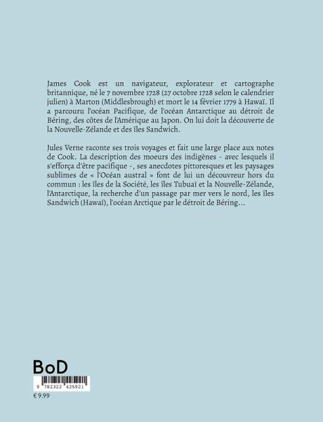 James Cook est un navigateur, explorateur et cartographe britannique, né le 7 novembre 1728 (27 octobre 1728 selon le calendrier julien) à Marton (Middlesbrough) et mort le 14 février 1779 à Hawaï. Il a parcouru l'océan Pacifique, de l'océan Antarctique au détroit de Béring, des côtes de l'Amérique au Japon. On lui doit la découverte de la Nouvelle-Zélande et des îles Sandwich.Jules Verne raconte ses trois voyages et fait une large place aux notes de Cook. La description des moeurs des indigènes - avec lesquels il s'efforça d'être pacifique -, ses anecdotes pittoresques et les paysages sublimes de « l'Océan austral » font de lui un découvreur hors du commun : les îles de la Société, les îles Tubuaï et la Nouvelle-Zélande, l'Antarctique, la recherche d'un passage par mer vers le nord, les îles Sandwich (Hawaï), l'océan Arctique par le détroit de Béring...