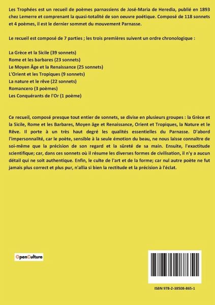 Les Trophées est un recueil de poèmes parnassiens de José-Maria de Heredia, publié en 1893 chez Lemerre et comprenant la quasi-totalité de son oeuvre poétique. Composé de 118 sonnets et 4 poèmes, il est le dernier sommet du mouvement Parnasse. Le recueil est composé de 7 parties ; les trois premières suivent un ordre chronologique : La Grèce et la Sicile (39 sonnets) Rome et les barbares (23 sonnets) Le Moyen Âge et la Renaissance (25 sonnets) L'Orient et les Tropiques (9 sonnets) La nature et le rêve (22 sonnets) Romancero (3 poèmes) Les Conquérants de l'Or (1 poème) Ce recueil, composé presque tout entier de sonnets, se divise en plusieurs groupes : la Grèce et la Sicile, Rome et les Barbares, Moyen âge et Renaissance, Orient et Tropiques, la Nature et le Rêve. Il porte à un très haut degré les qualités essentielles du Parnasse. D'abord l'impersonnalité, car le poète, sensible à la seule émotion du beau, ne nous laisse connaître de soi-même que la précision de son regard et la sûreté de sa main. Ensuite, l'exactitude scientifique; car, dans ces sonnets où il résume les diverses formes de civilisation, il n'y a aucun détail qui ne soit authentique. Enfin, le culte de l'art et de la forme; car nul autre poète ne fut jamais plus correct et plus pur, n'allia si bien la rectitude et la précision à l'éclat.