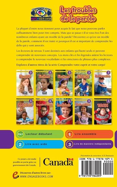 La plupart d'entre nous tiennent pour acquis le fait que nous pouvons parler suffisamment bien pour être compris. Mais que se passe-t-il si vous êtes l'un des nombreux enfants ayant un trouble de la parole? Découvrez ce qu'est un trouble de la parole, comment il est traité et pourquoi il est si important de comprendre les défis qui y sont associés. Les lecteurs de niveau 3 sont destinés aux enfants qui lisent seuls et peuvent comprendre de nouveaux concepts. Les mots clés et les légendes aident les lecteurs à comprendre le nouveau vocabulaire et les structures de phrases plus complexes. Ce projet a été rendu possible en partie grâce au gouvernement du Canada.