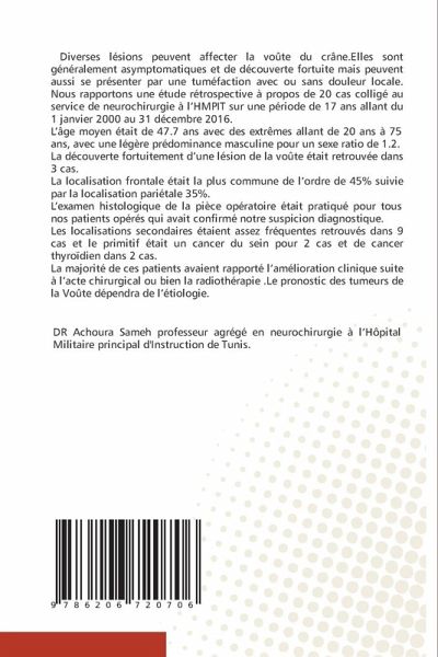 Diverses lésions peuvent affecter la voûte du crâne.Elles sont généralement asymptomatiques et de découverte fortuite mais peuvent aussi se présenter par une tuméfaction avec ou sans douleur locale. Nous rapportons une étude rétrospective à propos de 20 cas colligé au service de neurochirurgie à l'HMPIT sur une période de 17 ans allant du 1 janvier 2000 au 31 décembre 2016.L'âge moyen était de 47.7 ans avec des extrêmes allant de 20 ans à 75 ans, avec une légère prédominance masculine pour un sexe ratio de 1.2.La découverte fortuitement d'une lésion de la voûte était retrouvée dans 3 cas.La localisation frontale était la plus commune de l'ordre de 45% suivie par la localisation pariétale 35%.L'examen histologique de la pièce opératoire était pratiqué pour tous nos patients opérés qui avait confirmé notre suspicion diagnostique.Les localisations secondaires étaient assez fréquentes retrouvés dans 9 cas et le primitif était un cancer du sein pour 2 cas et de cancer thyroïdien dans 2 cas.La majorité de ces patients avaient rapporté l'amélioration clinique suite à l'acte chirurgical ou bien la radiothérapie .Le pronostic des tumeurs de la Voûte dépendra de l'étiologie.