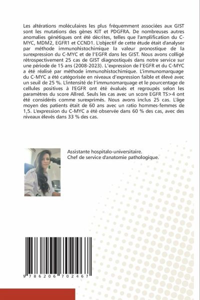 Les altérations moléculaires les plus fréquemment associées aux GIST sont les mutations des gènes KIT et PDGFRA. De nombreuses autres anomalies génétiques ont été décrites, telles que l'amplification du C-MYC, MDM2, EGFR1 et CCND1. L'objectif de cette étude était d'analyser par méthode immunohistochimique la valeur pronostique de la surexpression du C-MYC et de l'EGFR dans les GIST. Nous avons colligé rétrospectivement 25 cas de GIST diagnostiqués dans notre service sur une période de 15 ans (2008-2023). L'expression de l'EGFR et du C-MYC a été réalisé par méthode immunohistochimique. L'immunomarquage du C-MYC a été catégorisée en niveaux d'expression faible et élevé avec un seuil de 25 %. L'intensité de l'immunomarquage et le pourcentage de cellules positives à l'EGFR ont été évalués et regroupés selon les paramètres du score Allred. Seuls les cas avec un score EGFR TS>4 ont été considérés comme surexprimés. Nous avons inclus 25 cas. L'âge moyen des patients était de 60 ans avec un ratio hommes-femmes de 1,5. L'expression du C-MYC a été observée dans 60 % des cas, avec des niveaux élevés dans 33 % des cas.