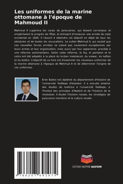 Mahmud II supprima les corps de janissaires, qui étaient corrompus et empêchaient le progrès de l'État, et entreprit d'instaurer une armée de style occidental en 1826. Il réussit à atteindre cet objectif en dépit de tous les obstacles et de toutes les accusations. Le sultan Mahmud II, qui voulait que ses nouvelles forces armées ne soient pas seulement européennes par leurs armes et leur organisation, mais aussi par leur apparence, procéda à une réforme vestimentaire. Selon cette réforme, le fez, le pantalon et le setre ont été adoptés à la place du turban matelassé, du salwar, du kaftan et du boléro. L'objectif de ce livre est d'examiner les nouveaux uniformes de la marine ottomane à l'époque de Mahmud II et de déterminer l'origine de ces uniformes.