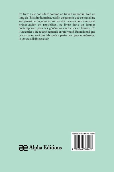 Les vacances" est un livre classique, qui a eu une valeur significative tout au long de l'histoire, et pour garantir que sa sagesse intemporelle ne soit jamais perdue, Alpha Editions l'a soigneusement préservé en le republiant dans un format moderne et accessible aux générations présentes et futures. Soigneusement reformaté, retapé , et nouvellement conçue, cette édition offre un texte clair et lisible, sans copies numérisées de l'uvre originale, Alpha Editions se consacre à insuffler une nouvelle vie aux livres anciens et classiques, rendant ces trésors littéraires à nouveau disponibles pour les lecteurs qui chérissent l'histoire. culture et savoir intemporel.