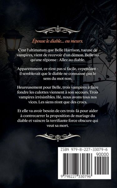 -Épouse le diable... ou meurs. C'est l'ultimatum que Belle Harrison, tueuse de vampires, vient de recevoir d'un démon. Belle n'a qu'une réponse : Allez au diable. Apparemment, ce n'est pas si facile, cependant - il semblerait que le diable ne connaisse pas le sens du mot non. Heureusement pour Belle, trois vampires à faire fondre les culottes viennent à son secours. Trois vampires irrésistibles. Hé, nous avons tous nos vices. Les siens n'ont que des crocs. Et elle va avoir besoin de ces trois-là pour aider à contrecarrer la proposition de mariage du diable et vaincre la terrifiante force obscure qui veut sa mort.