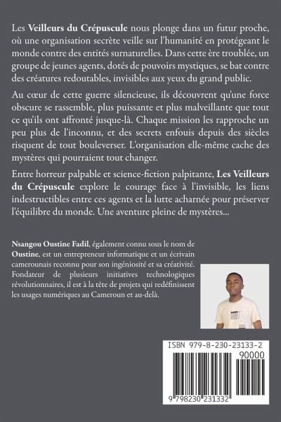 Les Veilleurs du Crépuscule nous plonge dans un futur proche, où une organisation secrète veille sur l'humanité en protégeant le monde contre des entités surnaturelles. Dans cette ère troublée, un groupe de jeunes agents, dotés de pouvoirs mystiques, se bat contre des créatures redoutables, invisibles aux yeux du grand public. Au cur de cette guerre silencieuse, ils découvrent qu'une force obscure se rassemble, plus puissante et plus malveillante que tout ce qu'ils ont affronté jusque-là. Chaque mission les rapproche un peu plus de l'inconnu, et des secrets enfouis depuis des siècles risquent de tout bouleverser. L'organisation elle-même cache des mystères qui pourraient tout changer. Entre horreur palpable et science-fiction palpitante, Les Veilleurs du Crépuscule explore le courage face à l'invisible, les liens indestructibles entre ces agents et la lutte acharnée pour préserver l'équilibre du monde. Une aventure pleine de mystères, de créatures terrifiantes et de trahisons qui vous tiendra en haleine jusqu'à la dernière page.